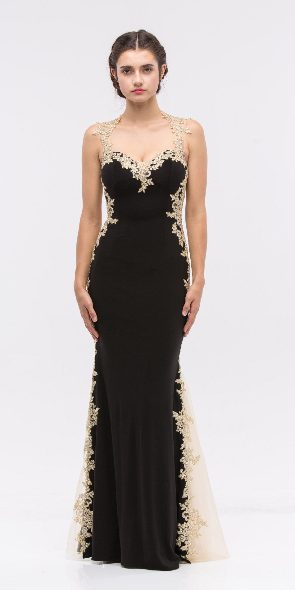 Eureka Fashion 6006 Sheath Mermaid Silhouette Gown Black Gold Floor Length Lace Trim