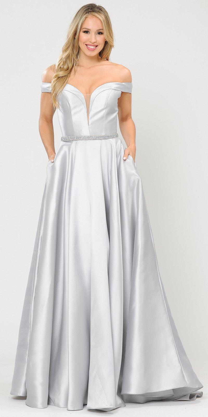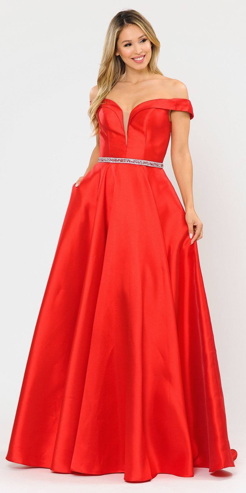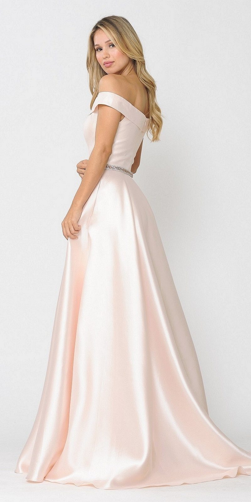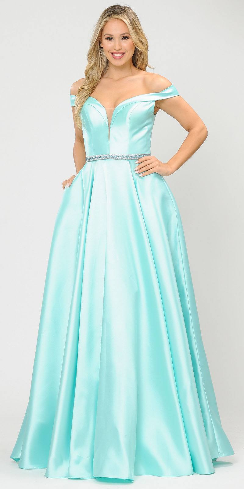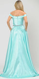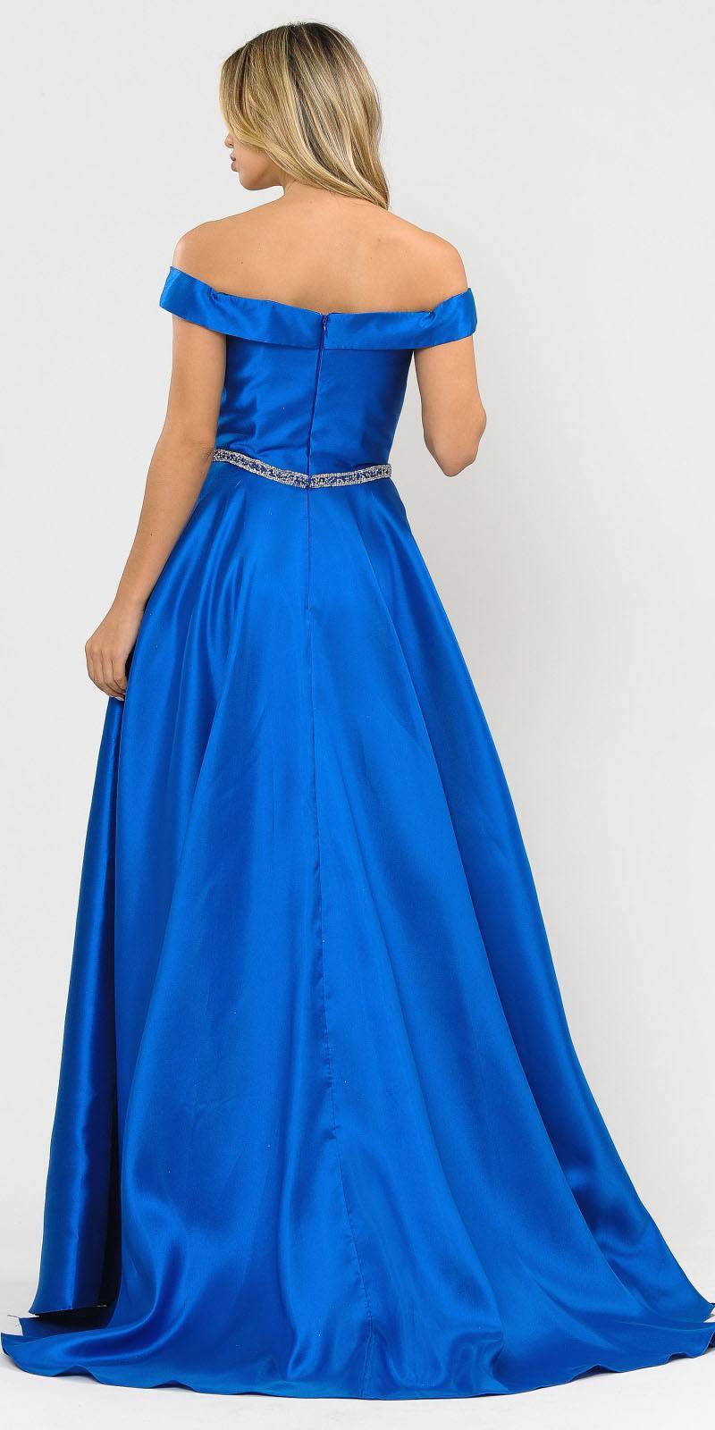 Dress up for your next special occasion in this stunning off-shoulder style long formal dress in royal-blue by Poly USA | Ed Young 8686. Made of silky satin soft material, this ball gown features a stylish fold-over v-shape neckline with sheer-inset, while the natural waist is belted with a dazzling band and added with side pockets. This a-line silhouette full-length dress is ideal for prom, red carpet events, gala night or in any other special occasions!