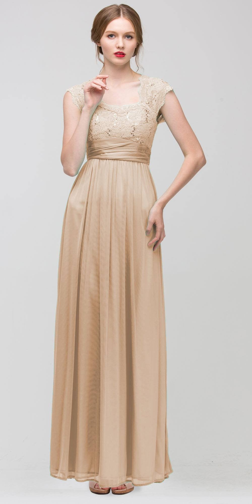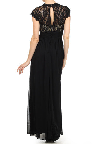 Pose in front of the mirror and admire yourself for your gorgeous looks before heading out for a grand dinner party in this beautiful dress in mocha. A floral lace panel adorns the fitted bodice to create an endearing pattern on the yoke and short sleeves. A queen anne neckline and a keyhole back pep up the beauty of this lace panel. A ruched waistline graces the empire waist and leads to a long pleated skirt reaching up to floor-length. A contrasting lining highlights the bodice for an attractive design.