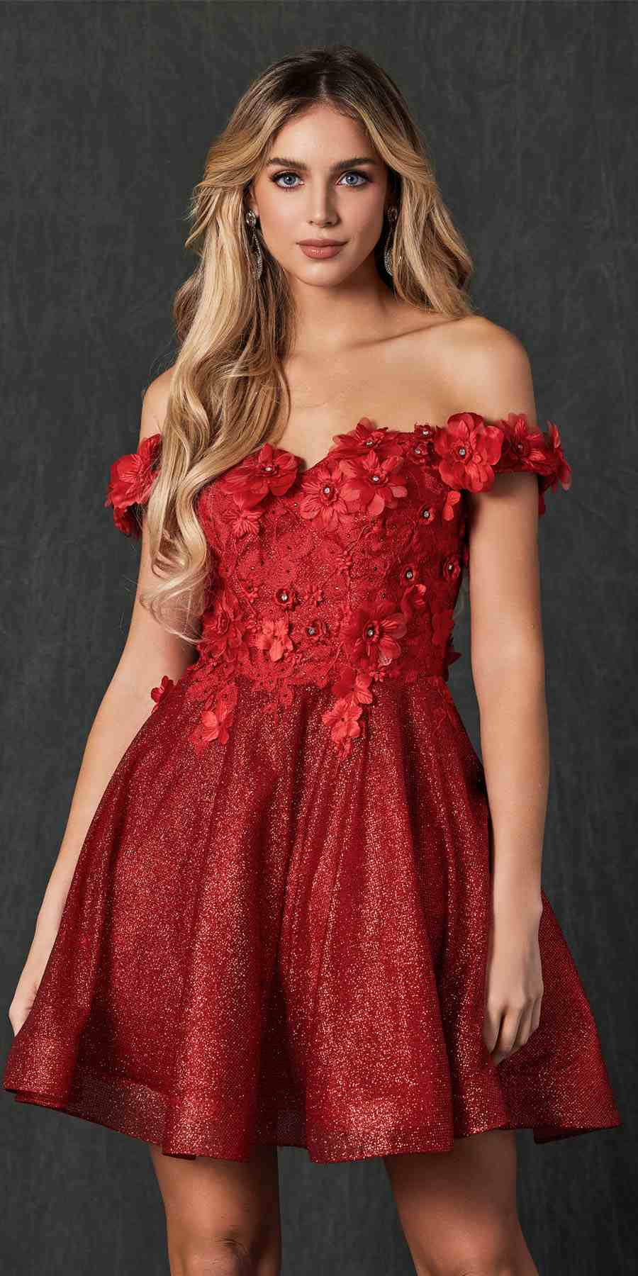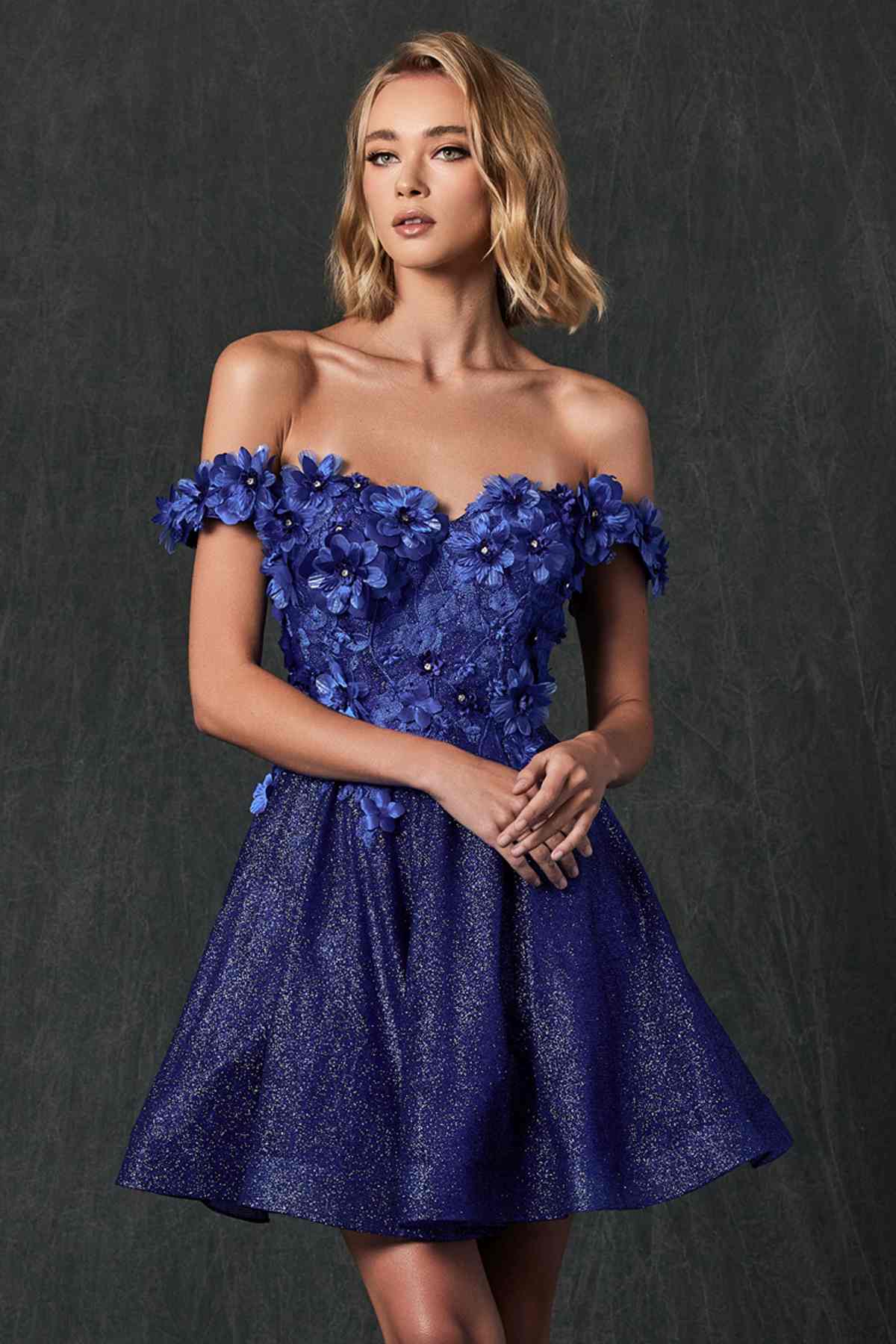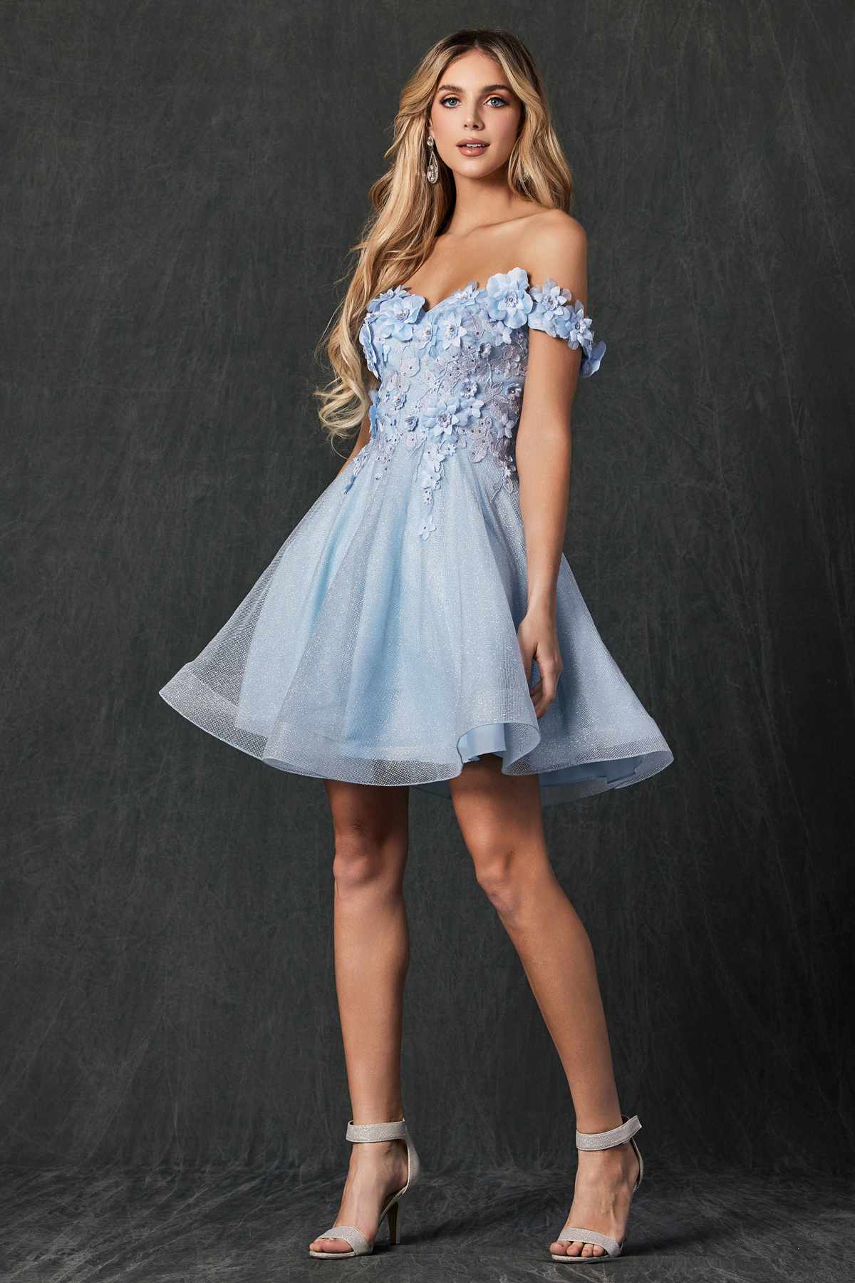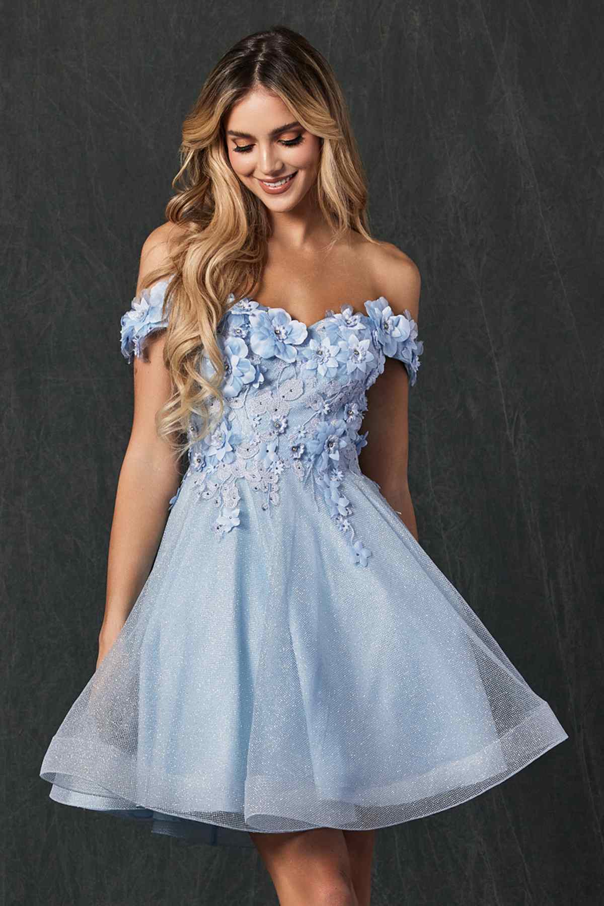 Dazzle the evening in this beautiful short A-line glitter mesh dress by Juliet 861, which features an off the shoulder strap design, with 3D floral applique, rhinestones that accent the bodice and zipper back. A beautiful short fit and flare A-line dress for homecomingdamas, prom or any special occasion!