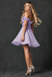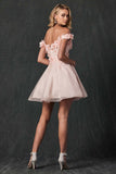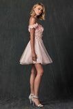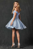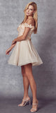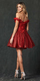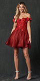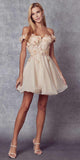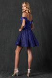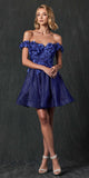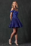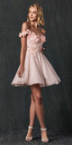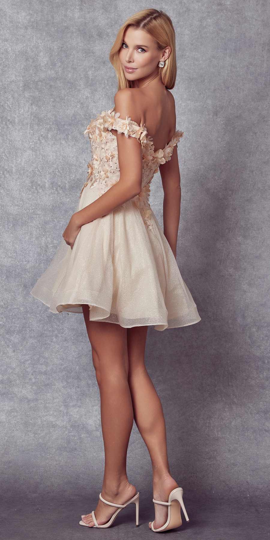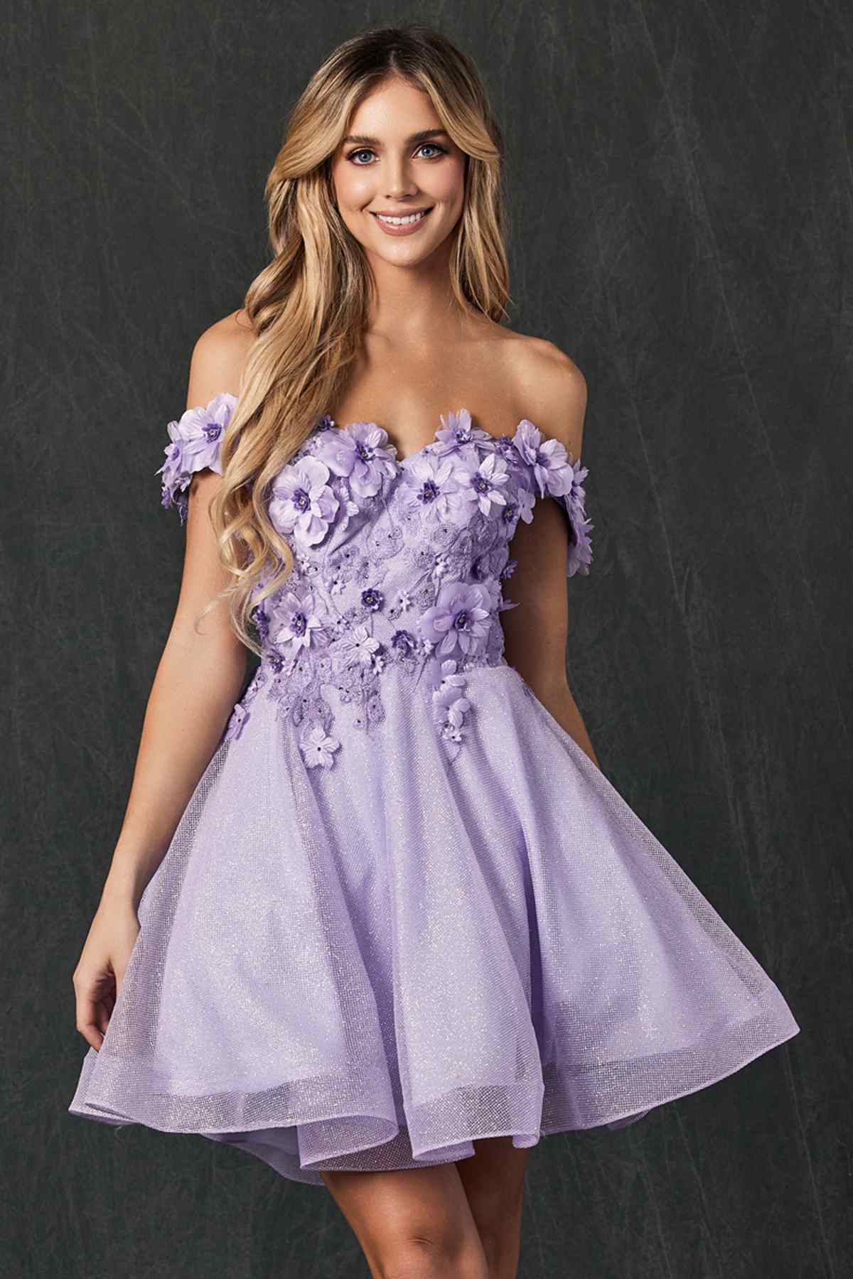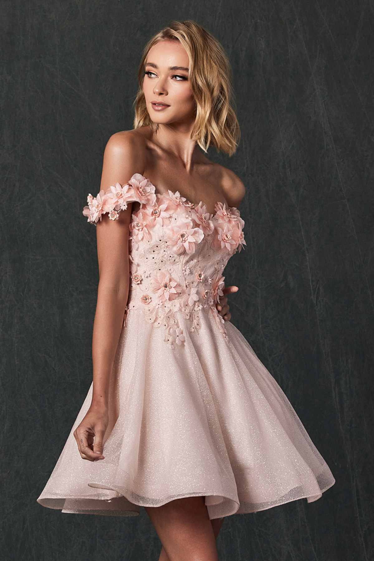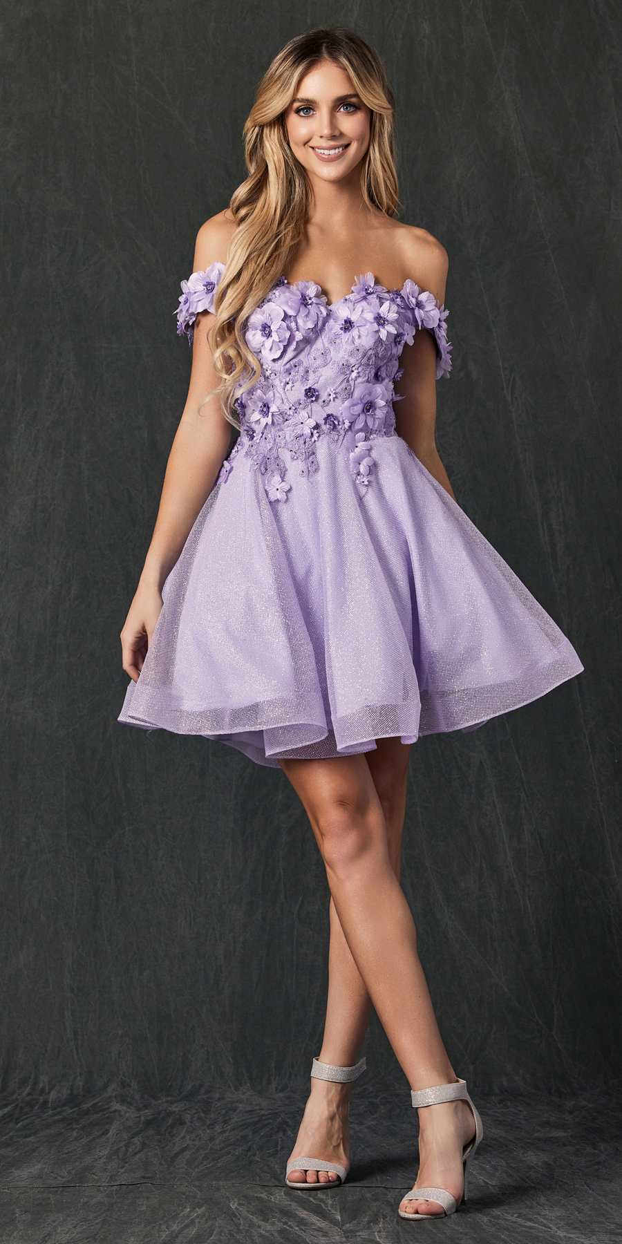 Dazzle the evening in this beautiful short A-line glitter mesh dress by Juliet 861, which features an off the shoulder strap design, with 3D floral applique, rhinestones that accent the bodice and zipper back. A beautiful short fit and flare A-line dress for homecomingdamas, prom or any special occasion!