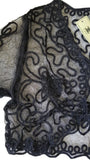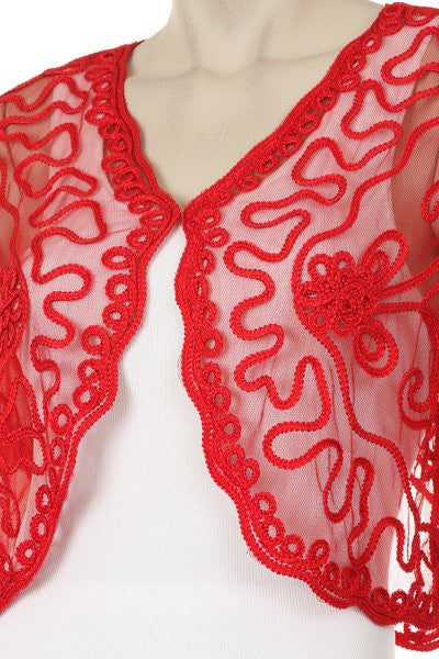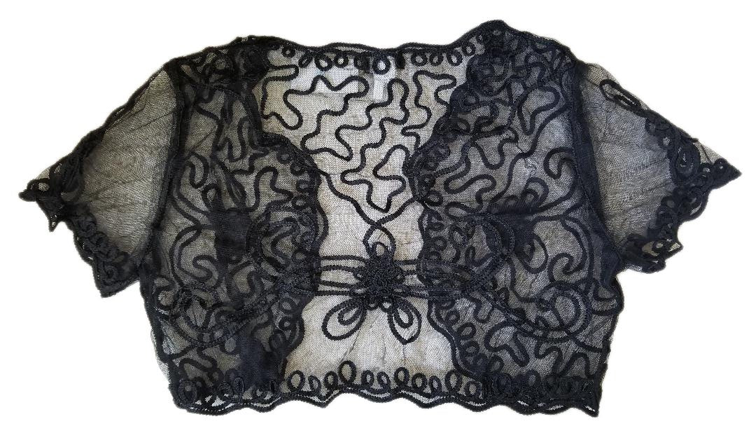 This beautiful short sleeve black shrug/bolero top is cute and is the perfect complement to your dress. This short bolero features mesh see through sleeves and a lace embroidered pattern and can be attached together to close the front with a small clasp.