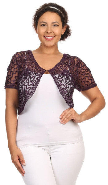 This beautiful short sleeve white lace bolero jacket is accented with a floral pattern and small rhinestones. Cropped with embroidered detailing, sheer, clasp in front. It's a perfect compliment to your dress. Great for your wedding or bridal or accessory for other events.