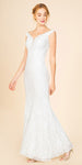 Stand out and shine wearing this mermaid style long formal dress by Eureka Fashion 8050 in burgundy. This elegant gown features the trendy off-the-shoulder style with sheer inset V-shape bodice. Made of delicate lace fabric with floral design, lined with jersey, this curve-hugging full-length dress is an excellent outfit for gala, military or marine ball, awards night or prom.