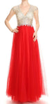 This long formal dress by J&J Fashion USA is absolutely a dream dress. The illusion fitted bodice is cap sleeved and covered with iridescent sparkly rhinestones and has a deep v-neck and cut-out back, paired with tulle a-line full-length skirt. A perfect outfit for prom, red carpet events, awards night or any other formal events.