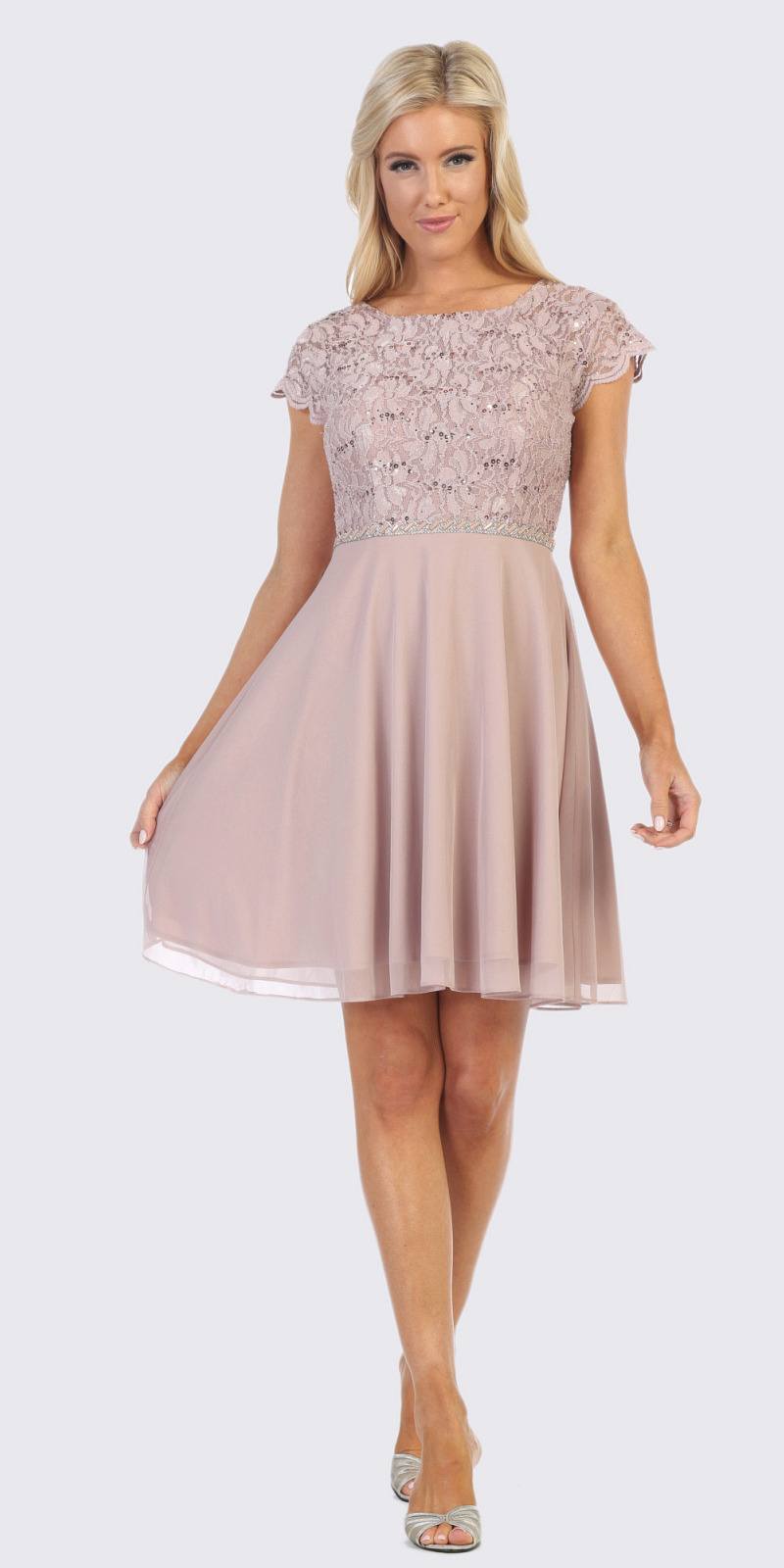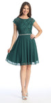 Step into this gorgeous short cocktail dress by Celavie 6394-S, a short-sleeved dress with lace bodice, bead embellished waist and flaring chiffon skirt. A lovely outfit for wedding events, cocktail party, dinner party or any other special celebrations.