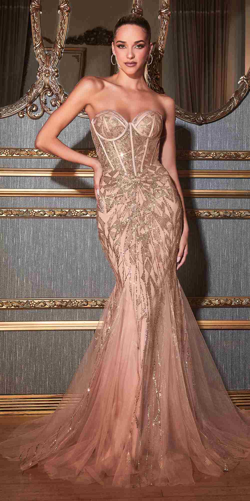 Imagine yourself in this beautiful floor length mermaid evening gown for your next formal event by Ladivine CB116. This long formal is strapless with a sweetheart neckline and features a corset boned bodice embellished with glitter. An ideal full-length dress for red carpet events, pageant, prom or in any other formal occasions!