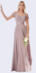 Enjoy the evening in this beautiful floor length chiffon A-line gown by Cinderella Divine CD0156. This dress features a cold shoulder strap, pleating and a satin belt line. Have a great and memorable time wearing this flowy dress at your next formal occasion.