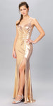 Rose Gold Ruched Bodice Metallic Long Prom Dress with Slit